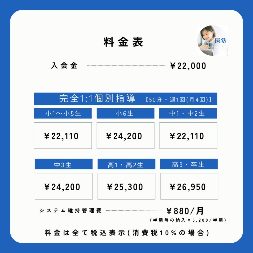 ※季節講習会のご料金につきましては、生徒様の目標と現状にあわせて、必要な授業数を担任よりご提案させていただき、保護者様にご納得頂いた上で、上記授業料と同じ金額単価で行います。